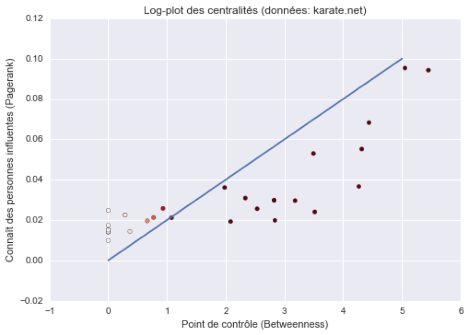 C’est pour cela qu’il est intéressant de visualiser le pagerank en fonction de la betweenness. Cela permet d’identifier les nœuds qui ont une stratégie plus de point de passage (bas/droite) et ceux qui ont une stratégie de leader (haut/gauche).